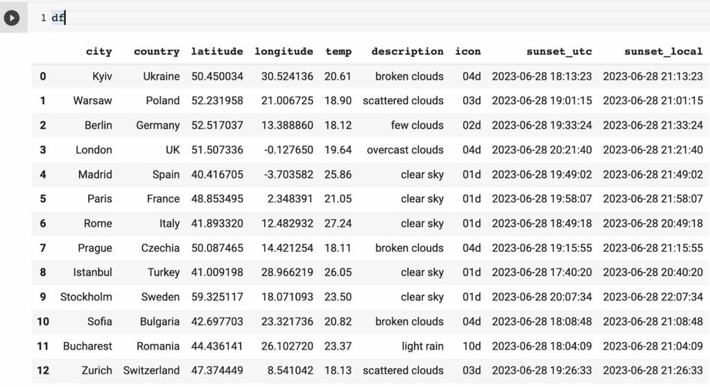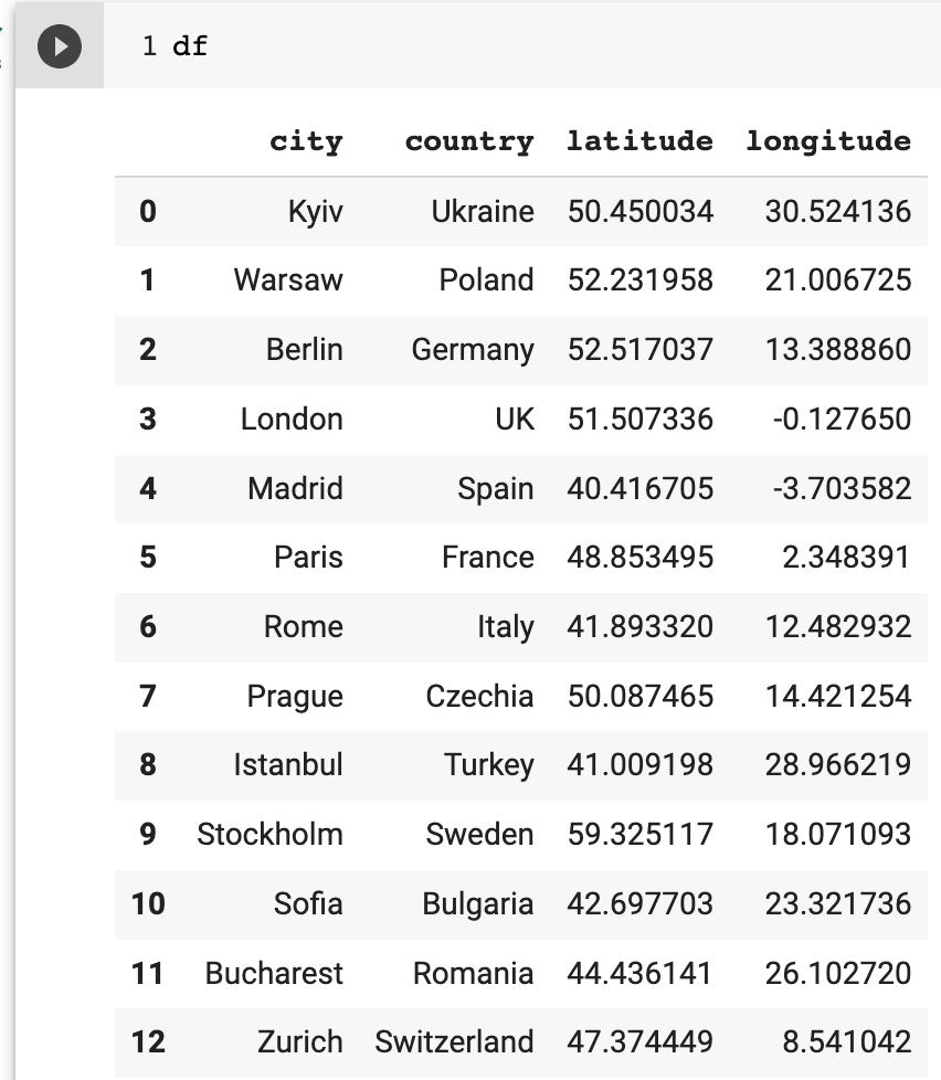 cities = [ ["Kyiv", "Ukraine"], ["Warsaw", "Poland"], ["Berlin", "Germany"], ["London", "UK"], ["Madrid", "Spain"], ["Paris", "France"], ["Rome", "Italy"], ["Prague", "Czechia"], ["Istanbul", "Turkey"], ["Stockholm", "Sweden"], ["Sofia", "Bulgaria"], ["Bucharest", "Romania"], ["Zurich", "Switzerland"], ] df = pd.DataFrame(cities, columns=["city", "country"])Since the OpenWeather API endpoint requires geographical coordinates such as latitude and longitude, we need to perform geocoding for each city. I would like to use the Nominatim geocoder provided by OpenStreetMap.
